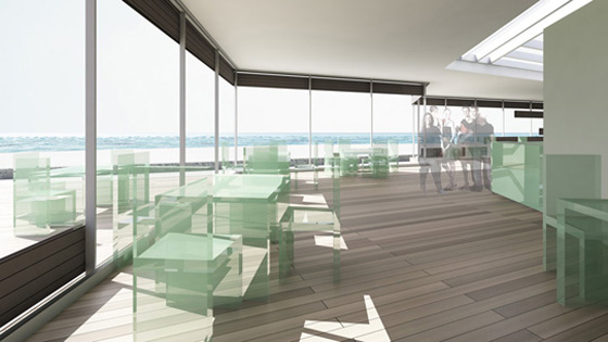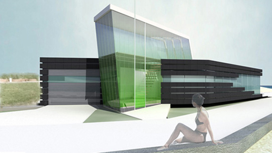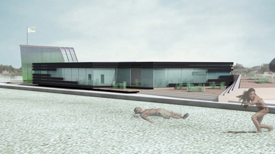 Die Teilnahme am Wettbewerb bis zur Endrunde sieht einen Baukörper vor, der sich zum einen an die Strandsituation anpasst, zum anderen aber auch hervorsticht. Das Glas gewehrt die freie Sicht und das Holz bildet den Übergang zur Natur. Für die Rettungsschwimmer ist ein Aussichtsturm vorgesehen worden, der sich aus dem Baukörper herausentwickelt.