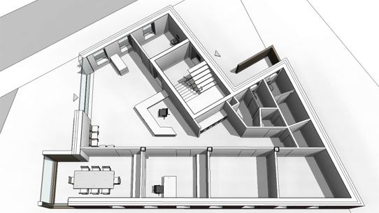 an und staffelt sich dadurch nach oben hin. Ausstellungsraum und Chefzimmer