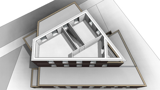 Der verklinkerte Baukörper passt sich zu allen Seiten an die Nachbarbebauung